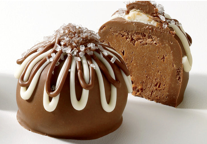 Caramel crème brûlée ganache center, coated twice in milk chocolate, and sprinkled with sugar crystals.